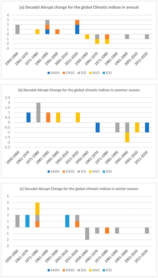 Decadal abrupt change for the global climatic indices (a) annual, (b) Summer season, and (c) winter season.