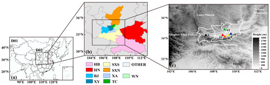 (a) The 36 km (D01) and 12 km (D02) modeling domains, (b) subdivided source regions used in CAMx, and (c) topographic map of the Guanzhong basin and surrounding areas. The triangles represent air quality stations in the five cities of the Guanzhong Basin used in the analysis of the sources of O3 pollution. (Ⅰ: WN_RBS in Weinan; Ⅱ: XA_LTD in Xi’an; Ⅲ: XA_XZ in Xi’an; Ⅳ: XY_NS in Xianyang; Ⅴ: BJ_SLH in Baoji; Ⅵ: TC_NDMC in Tongchuan).