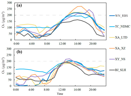 Observed hourly O3 concentration on (a) 12 June (“southeast high-type”), and (b) 15 June (“northeast ridge-type”) in the Guanzhong basin. Grey dot lines in each panel denote the Chinese national air quality standard for O3 (i.e., 200 μg/m3).
