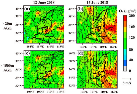 Simulated O3 concentration and wind fields at an elevation of (a,b) ~20 m and (c,d) ~1500 m AGL at 14:00 LT on (a,c) 12 June (“southeast high-type”), and (b,d) 15 June (“northeast ridge-type”) in the Guanzhong basin and surrounding areas.