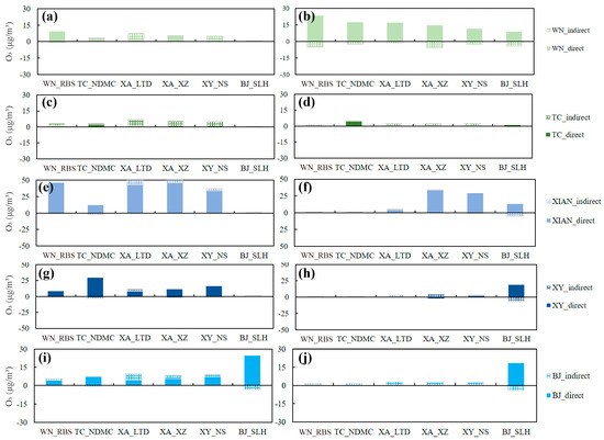 Figure 5 shows the contributions of direct and indirect transport from the five cites in the GZB to O3 concentrations. Under the two CTs, the O3 in the six sites was mostly from direct transport, while indirect transport from the emissions from Tongchuan had little contribution to the five sites outside Tongchuan. Notably, the characteristics of O3 transport from the emissions of each city in the GZB were different under the two CTs. Under the southeast high type, the emissions of Xi’an had a significant impact on the O3 pollution in Xi’an, Xianyang, and Weinan, with the direct (indirect) transport of 45.8 (4.8) μg/m3, 43.4 (9.3) μg/m3, 33.8 (3.4) μg/m3, and 45.9 (0.8) μg/m3 at XA_XZ, XA_LTD, XY_NS, and WN_RBS, respectively. Under the northeast ridge type, the impacts of the emissions of Xi’an concentrated in Xi’an and Boaji, and the emissions of Weinan greatly influenced the GZB overall, with the direct transport of 8.5–23.4 μg/m3. At this time, Baoji is downwind of other cities in the GZB and was influenced by direct transport, which contributed 19.0, 13.1, and 8.5 μg/m3 from the upwind cities (Xianyang, Xi’an, and Weinan, respectively).