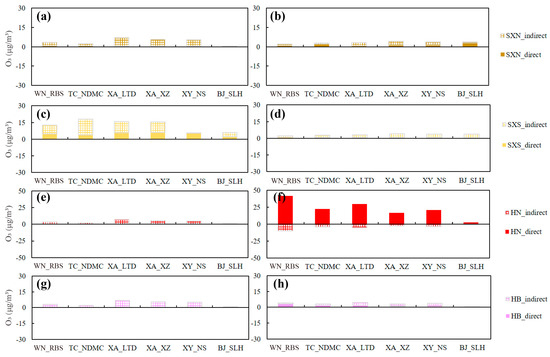 Figure 6 displays the contributions of direct and indirect transport from the major source regions (i.e., other parts of Shaanxi, Henan, and Hubei provinces) outside the GZB. Under the southeast high type, the emissions of south Shaanxi had an impact on the O3 pollution in the GZB, and indirect transport was the major form, which indicates that O3 precursors from south Shaanxi (most likely biogenic VOCs from Qin Mountain) were transported to the urban areas of the GZB and further reacted with the pollutants there. Under the northeast ridge type, direct transport from the emissions of Henan province contributed 16.5–41.9 μg/m3 to the O3 concentrations at the typical sites in the GZB (except BJ_SLH). Negative indirect transport (about −5 μg/m3) reduced the contributions from the emissions of Henan province, implying the negative effects of pollutant transport on O3 formation over the GZB. The contributions from the other source regions to O3 concentrations were not significant.