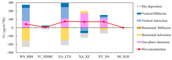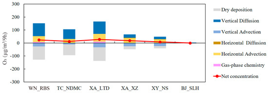 The contributions from the emissions of Xi’an to the daytime (10:00–18:00 LT) O3 processes (~15 m AGL) on 12 June (“southeast high-type”) in the 6 sites in the Guanzhong basin.