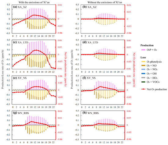 Hourly formation/loss chemical pathways of O3 production rates at (a,b) XA_XZ, (c,d) XA_LTD, (e,f) XY_NS, and (g,h) WN_RBS with/without the emissions of Xi’an on 12 June in the GZB (“southeast high-type”). Colored bars stand for different chemical pathways that contribute to O3 production rates at each site, and the red lines are net chemical contribution to O3 production rate at each site.