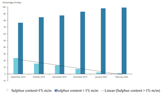 Furthermore, it is noteworthy that the percentage of ships using high-sulfur fuels has been consistently decreasing. In September 2019, 23.8% of ships were using high-sulfur fuels, a number that plummeted to 1.1% by February 2020. Conversely, there has been a significant surge in vessels opting for low-sulfur fuels (ranging from 0.10% to 0.50% m/m). This figure rose from 76.2% in September 2019 to encompass 98.9% of all vessels [3] (see Figure 1). These trends reflect a promising shift toward cleaner fuels and underscore the positive impact of regulatory measures on maritime emissions.