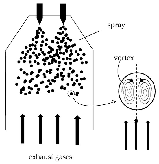 Absorption constitutes the fundamental process underlying desulphurization. Throughout the years, a variety of empirical and numerical models have been developed to study and elucidate its physical and chemical interactions during exposure to exhaust gases [12,13,14,15,16,17,18]. This article presents a simplified numerical model that simulates the absorption of sulfur oxides (SOX) through a water spray within a scrubbing process under diverse conditions.