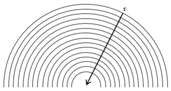 The calculation scheme involves breaking down the spherical droplet into NR concentric shells with uniform thickness, as illustrated in Figure 4. Concentration changes are assessed only radially, simplifying the problem to one dimension. Consequently, the evaluation of Hill’s vortex is omitted. Additionally, the simulation focuses on a droplet of pure fresh water, devoid of alkalis. Hence, reactions (6) and (7) are not considered. Upon analyzing Equations (4) and (5), it was determined that the equilibrium constant of (4) at 25 °C (equal to 1.4 × 10−2 kmol/m3) significantly surpasses the value of 6.5 × 10−8 kmol/m3 for (5) at the same temperature. Therefore, the latter is deemed negligible [25]. Under these conditions, only reactions (2.1)–(92.3) are taken into account. However, due to the instability of H2SO3, an alternative formulation is utilized by combining reactions (3) and (4):