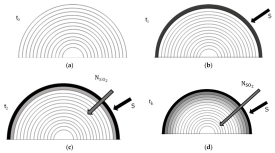 - The continuous entry of SO2 into the droplet, despite saturation conditions, is due to the diffusion phenomenon occurring in step (c). In this step, diffusion occurs due to the concentration gradient between the outermost shell and that immediately following. Diffusion acts after the chemical reaction because it is a slower process. The gross rate constant for reaction (3) is approximately 3.4 × 106 s−1 [30,31]. Therefore, it has been assumed that the chemical reaction and the new entry are instantaneous, ensuring continuous saturation conditions at the external volume.
