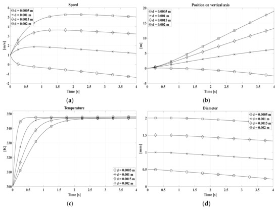 Droplet properties at a bulk gas temperature of 500 K and SO2 concentration of 620 ppm. (a) Speed of the droplet at different initial diameters as time varies; (b) Position on vertical axis of the droplet at different initial diameters as time varies; (c) Temperature of the droplet at different initial diameters as time varies; (d) Diameter of the droplet at different initial diameters as time varies.