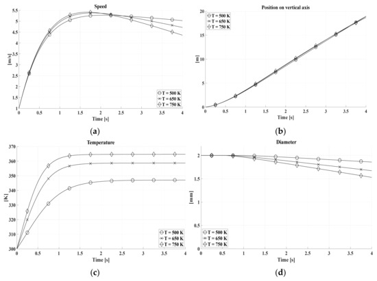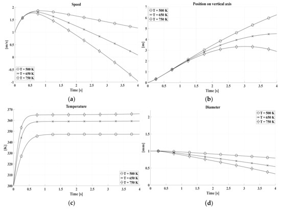 Evolution of droplet properties over time at various temperatures, Cg = 620 ppm, dp = 2.0 mm. (a) Speed of the droplet as time varies; (b) Position on vertical axis of the droplet as time varies; (c) Temperature of the droplet as time varies; (d) Diameter of the droplet as time varies.