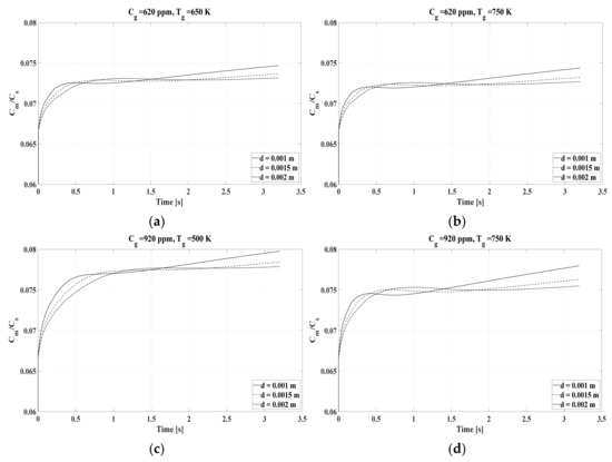 Evolution of the ratio between average concentration (Cm) and saturation concentration (Cs) over time for various initial droplet diameters. (a) SO2 concentration in bulk gas (Cg) = 620 ppm, gas temperature (Tg) = 500 K. (b) Cg = 620 ppm, Tg = 750 K. (c) Cg = 920 ppm, Tg = 500 K. (d) Cg = 920 ppm, Tg = 750 K.