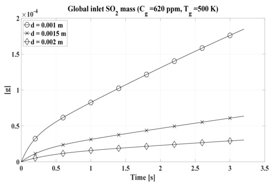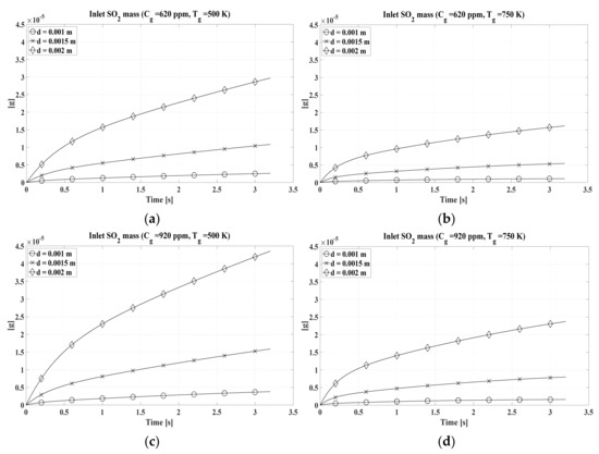 When the sulfur dioxide concentration (Cg) is 620 ppm and the temperature of the bulk gases (Tg) is 500 K (Figure 10a), droplets with diameters of 1 mm, 1.5 mm, and 2 mm absorb 2.60 × 10−6 g, 1.08 × 10−5 g, and 2.97 × 10−5 g of SO2, respectively. At the same sulfur dioxide concentration and a bulk gas temperature of 750 K (Figure 10b), the absorbed amounts of SO2 decrease to 1.09 × 10−6 g for a 1 mm droplet, 5.44 × 10−6 g for a 1.5 mm droplet, and 1.62 × 10−5 g for a 2 mm droplet.