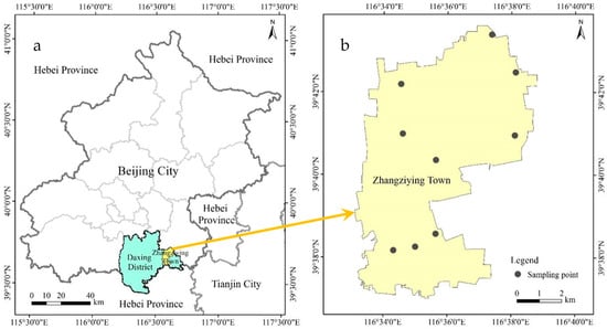 (a) The study area and (b) air quality monitoring site distribution in Zhangziying town (Daxing district of Beijing, China). The solid points indicate the location of air quality monitoring sites.