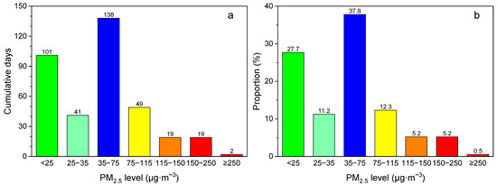 (a) Cumulative days and (b) its proportion to the total observed days for different levels of PM2.5 from October 2018 to September 2019. Different colors represent different PM2.5 levels.