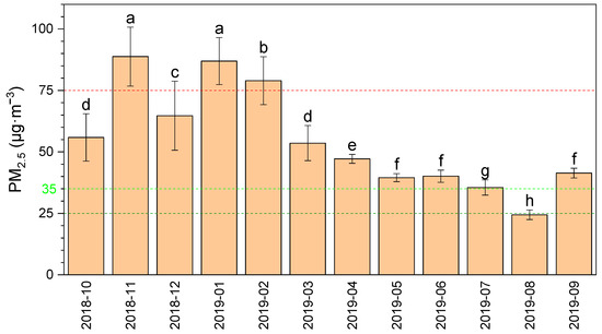 The levels of monthly PM2.5 from October 2018 to September 2019. Light green and red lines represent daily limits corresponding to classifications of “excellent” and “polluted” days, dark green represents the annual mean limit of European Union. Different letters indicate significant differences between different months according to Duncan’s test (p < 0.05).