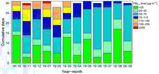 In terms of monthly PM2.5 concentrations, there was significant difference in monthly PM2.5 concentration over the investigation period, and the concentration of PM2.5 was markedly higher in winter and spring compared to summer and autumn (Figure 3). The light and above pollution weather (≥75 µg∙m−3) mainly occurred from October 2018 to March 2019 (six months in total), and 12.9–30.0% of days when moderately polluted standards were exceeded, depending on month (Figure 4). Among the six months, the proportion of moderate or above polluted days was higher in November, January and February, accounting for more than 25% of respective months. Two ultra-seriously polluted episodes occurred in November and January. The maximum number of cumulative days below 25 µg∙m−3 was in August, and the minimum was in November. The characteristics of PM2.5 also showed a certain trend with respect to monthly distribution. The result was consistent with that of Wang et al. [13]. In winter, static and steady weather conditions with less precipitation were favorable for the PM formation, thus leading to the high occurrence frequency of heavy pollution episodes [5,14]; at the same time, coal-fired heating in winter increased pollutant emissions, resulting in higher PM2.5 concentration in this period than that in other seasons. Under the influence of the summer monsoon, there were fast wind speed, deep vertical convection, and frequent precipitation, which were beneficial for aerosol diffusion and deposition; thus, the PM2.5 concentration was low [4].