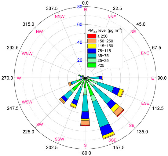 During the period from October 2018 to September 2019 (365 days), the number of days when the wind direction was 100°–250° was 321 in Zhangziying Town, accounting for 88% of the total days. The number of days when the wind direction was below 100° or above 250° was only 44, accounting for 12%; in these wind directions, the air quality can reach favorable or excellent levels (Figure 6). There were high concentrations of PM2.5 (>75 µg∙m−3) in the southeast, south and southwest wind directions (90° < wind direction < 248°). The wind directions in two ultra-seriously polluted events were south and southeast wind, respectively (Figure 6 and Figure 7a). These results indicated that the northerly wind was relatively clear, can dilute and disperse the pollutants in the Beijing area, but the southerly winds played the opposite role [22]. Former studies have also shown that the dominant wind direction in the increasing process of PM2.5 concentration in Beijing area is south and southeast, and Hebei Province and Shandong Province are the important sources of PM2.5 in Beijing [23,24].