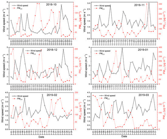 The PM2.5 pollution event in this study usually occurred from October 2018 to March 2019. From the daily average wind speed and PM2.5 concentration in these six months, it can be seen that PM2.5 pollution episodes occurred at wind speeds below 1.5 m∙s−1, and the air quality was excellent at wind speeds exceeding 2 m∙s−1, (Figure 8). From the daily average wind speed and PM2.5 concentration in the 12 months from October 2018 to September 2019, it can be shown that PM2.5 pollution events occurred at wind speeds below 3 m∙s−1, and wind speeds in two ultra-seriously polluted events were about 1 m∙s−1; the air quality was favorable or excellent at wind speeds exceeding 3 m∙s−1 (Figure 7b). The meteorological data from October 2018 to September 2019 showed that the study area had high frequency of light wind, reaching 91% of total days; there were only 33 days with wind speed exceeding 3 m∙s−1. Many studies showed that there was a negative correlation between wind speed and PM2.5 [24,25,26]. However, the wind speed had a complex effect on PM2.5 concentration, and dust storms caused by strong wind can also cause the increase in PM2.5 concentration, especially in spring [27]. This may also be one of the main reasons for the high PM2.5 concentration in spring in southern Beijing.
