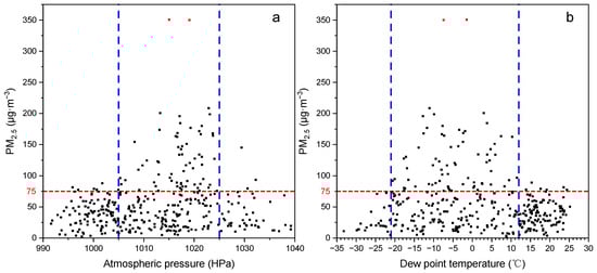 Effects of (a) atmospheric pressure and (b) dew point temperature on PM2.5 concentration (n = 365).