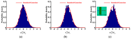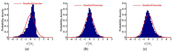PDFs of the velocity fluctuations at height H. (a) Streamwise velocity; (b) spanwise velocity; (c) vertical velocity.
