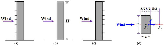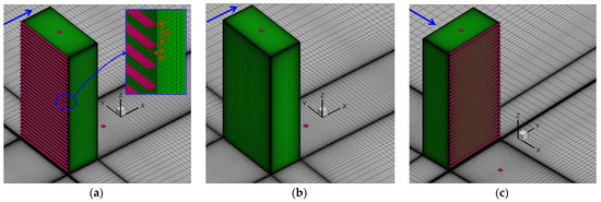 Figure 3a–c presents a schematic view of the building geometry and envelope features. Figure 4 displays the mesh systems used in this study. The studied building was a high-rise with a length (L):width (B):height (H) ratio of 1:2:4. This is the most common shape for commercial or residential high-rise buildings in East Asia. LES was performed for three cases: the base case without facade appurtenances, the case with windward overhangs, and the case with leeward overhangs. The mean velocity profile of the oncoming flow followed a logarithmic law. The building height H was 160 mm, and UH = 1.37 m/s was the mean streamwise velocity at the top of the building. The Reynolds number, based on UH and the building width B, was approximately 7500. As described previously, the geometrical scale of the generated atmospheric boundary layer was approximately 1:600. Accordingly, the building was divided into 32 floors in the vertical direction and a total of 32 overhangs were set on the windward or leeward surface of the building in the cases with appurtenances. Hence, the distance between overhangs was D = 5 mm in the vertical direction, corresponding to a height of 3 m per floor at the full scale. The width of the overhangs was W = 2 mm, corresponding to 1.2 m for the full-scale case.