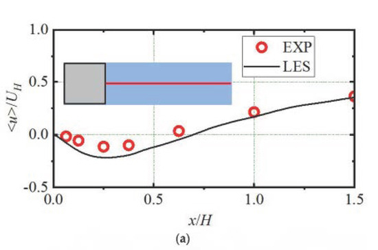 Before the simulations, the numerical algorithm and parameter settings for LES used in this study were validated against wind tunnel experiments on wind flow around a high-rise building with a square cross-section [21]. Figure 5a presents the comparisons of mean streamwise velocity along a horizontal line in streamwise direction (x/H is from 0 to 1.5, y/H = 0, z/H = 0.25). The calculated mean streamwise velocity by LES shows a favorable agreement with the experiment. The LES model used in this study was also validated by comparisons with the wind tunnel experiment in a thermal environment in previous studies [20,32].
