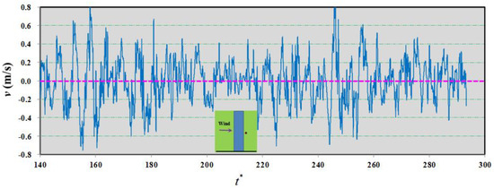 Time series of spanwise velocity fluctuation behind the building (x/H = 0.125, y/H = 0, z/H = 0.5).