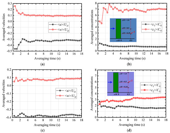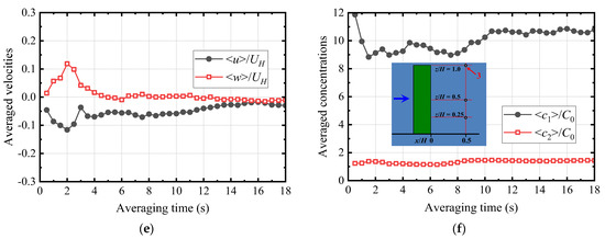 Changes in averaged values with averaging time at different points. Averaged (a) velocities at point 1; (b) concentrations at point 1; (c) velocities at point 2; (d) concentrations at point 2; (e) velocities at point 3; (f) concentrations at point 3.