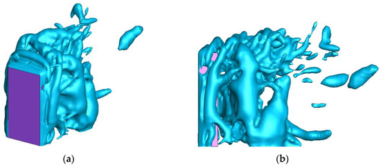 Figure 8 displays the vortex structures around the building as identified by the low-pressure center (p = −0.5 Pa) and the positive second invariant of the velocity gradient [Q = 500 s−2]. The smooth side vortex was generated from the edges of the front surface after flow separation; it then broke down at a downstream station. A series of large disorderly vortices were formed in the wake region behind the building. Overall, the vortex shapes identified from the low-pressure center and Q criteria are similar, indicating that both methods can be used to identify coherent vortex structures. The low-pressure center can be used to identify the vortex structures because the pressure is usually low in the center of a vortex in a turbulent flow. The large vortices identified with the low-pressure center are slightly coarser. Compared with the low-pressure center, the Q criteria can be better used to identify fine vortex structures, such as the horseshoe vortex ahead of the building near the ground. Hence, the Q criteria is more reliable for identifying the coherent vortex structures of flow around a blunt body.