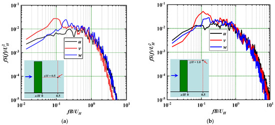 Power spectrum densities of u, v, and w velocity fluctuations behind the building. (a) At the point (x/H = 0.5, y/H = 0, z/H = 0.5); (b) at the point (x/H = 0.5, y/H = 0, z/H = 1.0).