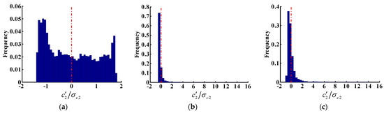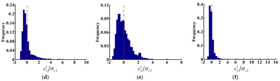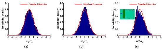Figure 10 and Figure 11 present the PDFs of the u, v, and w velocity fluctuations at two points behind the building located inside and outside the recirculation region, respectively. The occurrence position of the maximum frequencies was near zero, and all three components of the velocity fluctuations were in favorable agreement with the standard Gaussian distribution at both points. These distribution patterns are similar to that of the oncoming flow shown in Figure 2. Slight non-Gaussian features are observed in Figure 11c. It is possible that the flow did not reach the statistical stability at this position because of insufficient simulation time. This can be demonstrated by the change in mean velocity with averaging time at another position nearby shown in Figure 7e, in which the averaged vertical velocity <w> still slightly changed even after 18 s’ time averaging.