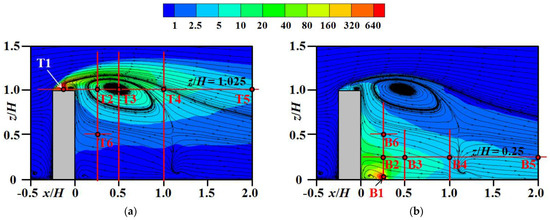 Pollutant statistics analysis from a large number of representative stations is useful for determining the dispersion patterns of a pollutant. Therefore, the pollutant statistics were studied for the points in Figure 12. Points T1 to T5 were located in a horizontal line slightly above the building (z/H = 1.025). Point T1 was just above the source location, and the distance from the source location gradually increased for points T2 to T5. Point T6 was located in a low-concentration region inside the wake behind the building (x/H = 0.25, z/H = 0.5). Point B1 was located just above the source station of the P2 pollutant. Points B2 to B5 were located in a horizontal line in the wake behind the building (z/H = 0.25). Point B6 was located at x/H = 0.25 and z/H = 0.5.