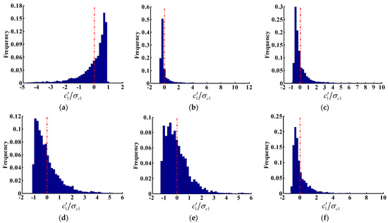 Figure 13 presents the distributions of the occurrence frequency for the P1 concentration fluctuations at points T1 to T6. Similarly, Figure 14 presents the frequency distributions of the P2 concentration fluctuations from point B1 to point B6. Unlike the PDF distributions of the velocity fluctuations shown in Figure 10 and Figure 11, the frequency patterns of pollutants were far from a Gaussian distribution at all of the locations. At locations far away from the source point, negative fluctuations were most frequent, but the maximum positive fluctuations were much larger. This was most notable for the P1 pollutant at point T2 and the P2 pollutant at point B2; for these stations, the maximum frequency was greater than 50% or 70%, respectively, and the maximum positive fluctuations reached nearly 12 to 16 standard deviations. Understanding this characteristic is critical for highly hazardous gases; instantaneous high values can result in a high exposure risk to people even if they are only exposed for a short time. At the locations near the source point, various frequency distribution patterns were observed. For the P1 pollutant at point T1, most instantaneous values were larger than the mean value, but the maximum negative fluctuation was much larger. For the P2 pollutant at point B1, the occurrence frequencies of positive and negative fluctuations were nearly equal, and the difference between the largest and smallest frequencies was small.