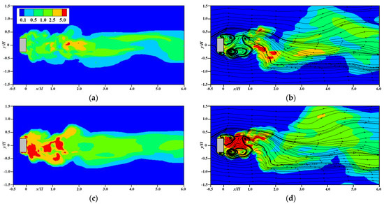 Figure 15 displays the normalized instantaneous P1 and P2 concentration distributions at two different representative instants on a horizontal plane (z/H = 0.5). The instantaneous distributions of streamlines are also displayed in Figure 15b,d, in which some eddies were generated near the side surface after flow separation and some large eddies had already moved downstream. After the P1 pollutant was transported to the wake behind the building from a high position, the dispersion patterns of P1 and P2 pollutants were quite similar; they were both affected by the large-scale periodic vortex-shedding phenomena. When the large-scale vortex motion was weak at time t1, the contour lines were smooth at the downstream stations for both P1 and P2 pollutants. At another instant, t2, when the periodic vortex-shedding phenomena was strong, the instantaneous distributions of both the P1 and P2 pollutants had a distinct meandering pattern.