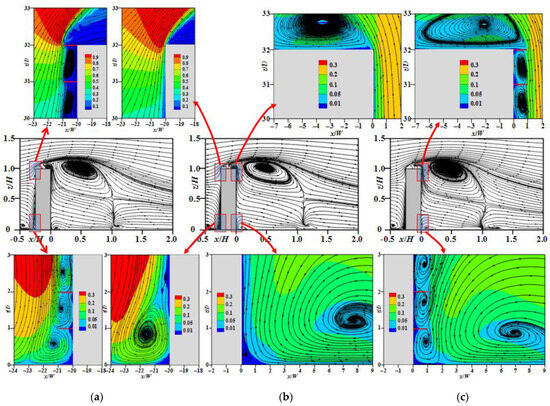 Figure 16 presents comparisons of the overall wind flow and local flow structures near the building facade for the three cases. A fine mesh system was used to simulate the cases with overhangs set on both the windward and leeward surfaces. Overall, the differences in the overall flow field among the three cases were small; however, the local wind flows near the building facade were greatly affected by the overhangs. For the case with windward overhangs, the ascending air in front of the building impinged on the overhangs and then formed a clockwise recirculation inside the upper floors; the descending air formed a counterclockwise recirculation inside the lower floors after it struck the overhangs. The opposite was observed for the case with leeward overhangs; counterclockwise recirculation occurred for most of the upper floors, whereas clockwise recirculation occurred for the lower floors near the ground. A small counterclockwise recirculation formed in front of the building near the ground in the base case; its size was reduced by the windward overhangs. The leeward overhangs also changed the counterclockwise recirculation near the back corner above the rooftop in the base case to a flat recirculation.
