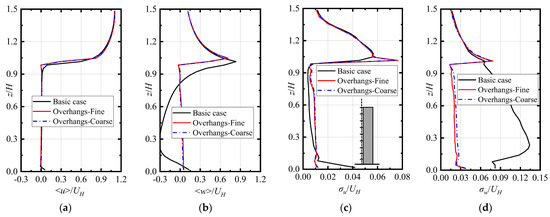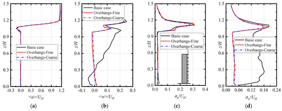 Distributions of mean velocities and their fluctuations along a vertical line through the leeward overhangs. (a) Mean streamwise velocity; (b) mean vertical velocity; (c) standard deviation of streamwise velocity; (d) standard deviation of vertical velocity.