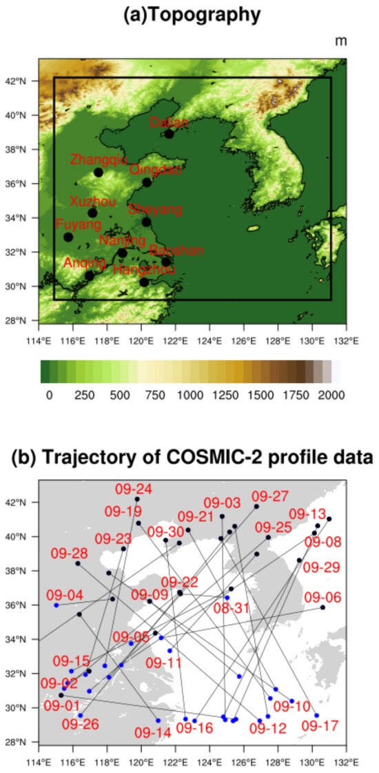 COSMIC–2 data were derived from the CDAAC (COSMIC Data Analysis and Archive Center) (https://data.cosmic.ucar.edu/gnss-ro/cosmic2/nrt/level2/, accessed on 30 November 2023). In this study, the wetPf2 near-real-time data set, including pressure, temperature, and humidity, was used for assimilation simulations. The daily dataset contained more than 5000 data files with a vertical resolution of 0.05 km. In this study, we selected the data within three hours around 00:00 every day in September for assimilation. The daily transit trajectories of the COSMIC satellites over the study domain are shown in Figure 1b.