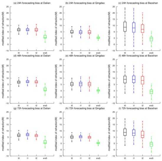 Based on the time when the forecasts were generated, the three forecasting tests of 72 h ahead (t0, t1, and t2) were further divided into three time series of 24-, 48-, and 72 h forecasts in advance, respectively. The differences among the three series were used to reflect the changes in model performance at different forecasting times. The box plots of the revised atmospheric refraction bias for the three tests (t0, t1, and t2) are given in Figure 2 based on the statistics obtained at the Dalian, Qingdao, and Baoshan radiosonde stations during the entire month of September within the levels from the ground to 10 km.