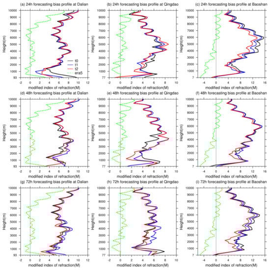 The profiles of revised atmospheric refraction bias versus height for the 24 h forecasts at (a) Dalian, (b) Qingdao, and (c) Baoshan station; for the 48 h forecasts at (d) Dalian, (e) Qingdao, and (f) Baoshan station; and for the 72 h forecasts at (g) Dalian, (h) Qingdao, and (i) Baoshan station. The black, blue, and red lines represent the bias profiles of the t0, t1, and t2 tests, respectively. The green lines represent the difference profiles of the ERA5 reanalysis data when compared with the station sounding data.