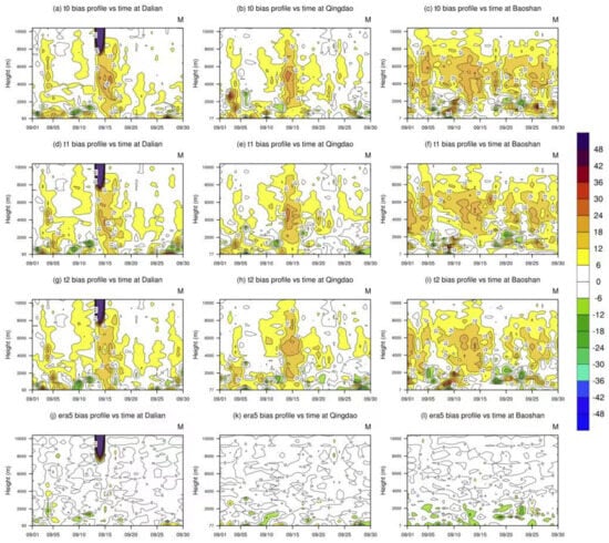 As shown in Figure 4, the revised atmospheric refraction biases of the three forecasting tests were positive for a majority of the time and were roughly concentrated within the levels of 3000–7000 m. The forecast results of the Dalian station on 13–16 September varied considerably from the sounding data, and the bias could be up to more than 200 M. This high bias caused the unusual increase in the bias above the altitude of 7000 m at the Dalian station, which is depicted in Figure 3. The ERA5 data (Figure 4j) also exhibit similar distributions and, therefore, this feature may be related to the quality of the sounding data.