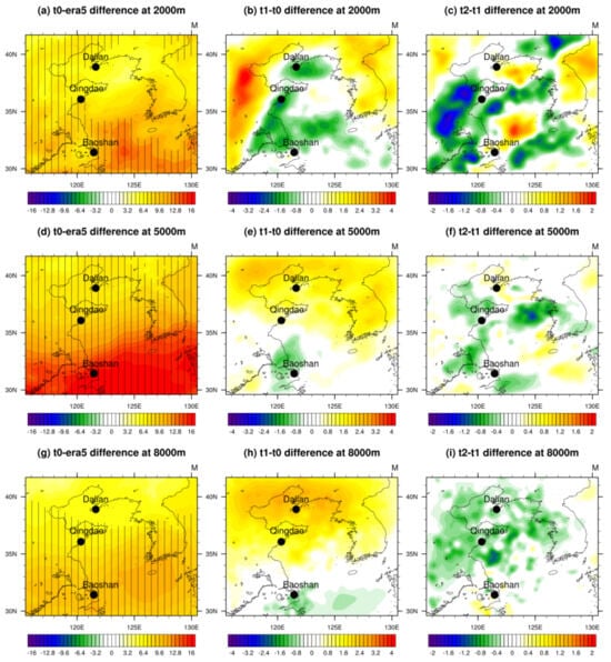 Figure 5 depicts the horizontal distributions of the differences in the 24 h forecasting biases among the three tests at specific levels. The locations of the three sounding stations are marked with black dots. Figure 5a,d,g shows the distributions of the 24 h forecasting bias between the t0 test and the ERA5 data at the levels of 2000 m, 5000 m, and 8000 m. The t0 test demonstrated a significant positive bias at all levels over the domain, and the bias increased from north to south. The forecasting bias at Baoshan station, with the lowest latitude, was significantly larger than that at Qingdao and Dalian stations in the north. At the three different levels, the largest meridional gradients occurred at the height of 5000 m (Figure 5d), which also corresponded to the values of the largest bias, and the bias was up to 15 M.