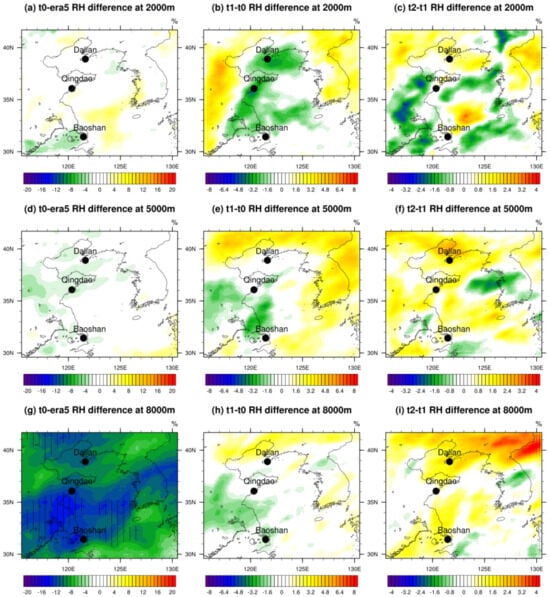 The spatial distributions of the differences in relative humidity from (a) t0 minus era5, (b) t1 minus t0, and (c) t2 minus t1 at the height of 2000m; from (d) t0 minus era5, (e) t1 minus t0, and (f) t2 minus t1 at the height of 5000 m; and from (g) t0 minus era5, (h) t1 minus t0, and (i) t2 minus t1 at the height of 8000 m. The three black dots represent the locations of the Dalian, Qingdao, and Baoshan stations. The areas shaded by strips represent the difference there passed the significance test at a 95% confidence level.