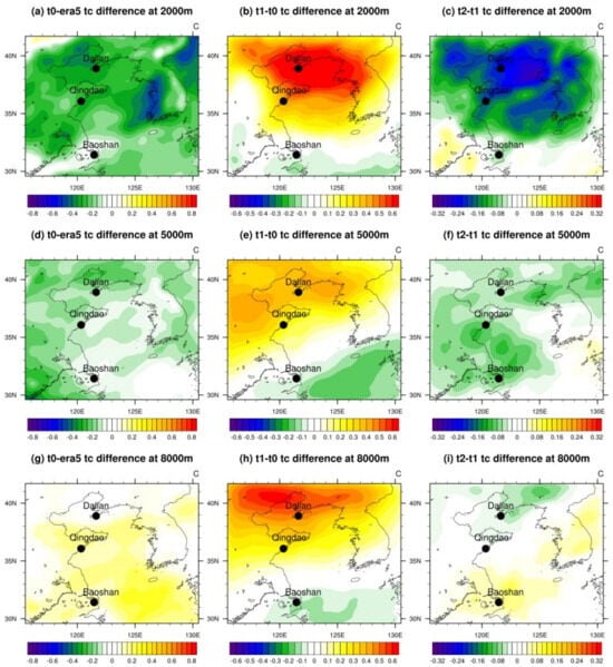 The spatial distributions of the differences in air temperature from (a) t0 minus era5, (b) t1 minus t0, and (c) t2 minus t1 at the height of 2000 m; from (d) t0 minus era5, (e) t1 minus t0, and (f) t2 minus t1 at the height of 5000 m; and from (g) t0 minus era5, (h) t1 minus t0, and (i) t2 minus t1 at the height of 8000 m. The three black dots represent the locations of the Dalian, Qingdao, and Baoshan stations.