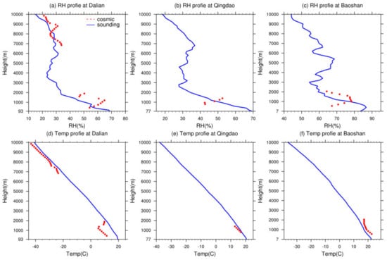 The profiles of relative humidity assimilated in the t1 and t2 test at (a) Dalian, (b) Qingdao, and (c) Baoshan station; and of air temperature assimilated in the t1 and t2 test at (d) Dalian, (e) Qingdao, and (f) Baoshan station. The blue lines represent the mean profiles of sounding data at 00:00 UTC, and the red scatters represent the COSMIC–2 data during the three hours before and after 00:00 UTC every day.