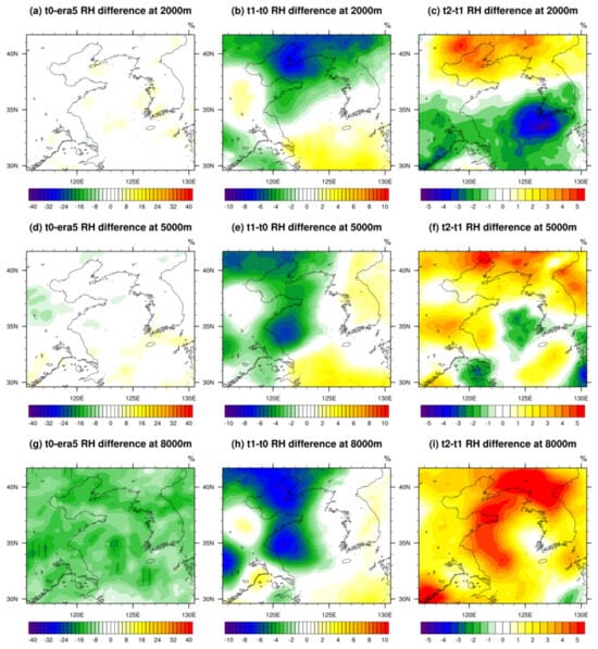 The spatial distributions of the differences in the initial relative humidity fields at 00:00 UTC from (a) t0 minus era5, (b) t1 minus t0, and (c) t2 minus t1 at the height of 2000 m; from (d) t0 minus era5, (e) t1 minus t0, and (f) t2 minus t1 at the height of 5000 m; and from (g) t0 minus era5, (h) t1 minus t0, and (i) t2 minus t1 at the height of 8000 m. The areas shaded by strips represent the difference there passed the significance test at a 95% confidence level.