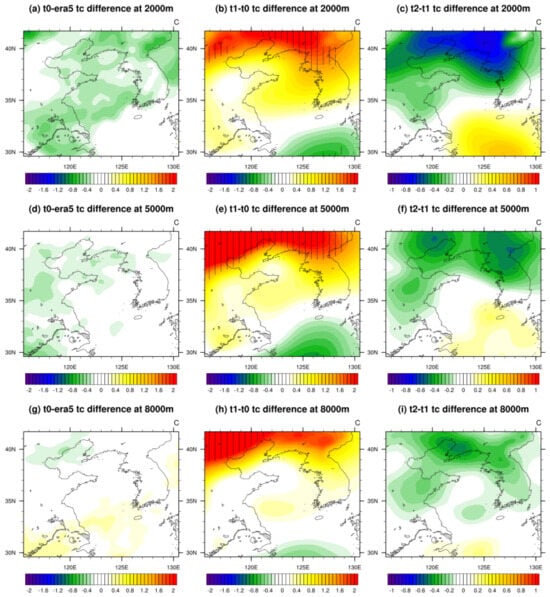 The spatial distributions of the differences in the initial temperature fields at 00:00 UTC from (a) t0 minus era5, (b) t1 minus t0, and (c) t2 minus t1 at the height of 2000 m; from (d) t0 minus era5, (e) t1 minus t0, and (f) t2 minus t1 at the height of 5000 m; and from (g) t0 minus era5, (h) t1 minus t0, and (i) t2 minus t1 at the height of 8000 m. The areas shaded by strips represent the difference there passed the significance test at a 95% confidence level.