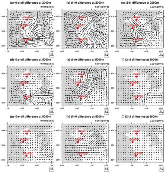 The spatial distributions of the differences in water vapor flux from (a) t0 minus era5, (b) t1 minus t0, and (c) t2 minus t1 at the height of 2000 m; from (d) t0 minus era5, (e) t1 minus t0; and (f) t2 minus t1 at the height of 5000 m, and from (g) t0 minus era5, (h) t1 minus t0, and (i) t2 minus t1 at the height of 8000 m. The three red dots represent the locations of the Dalian, Qingdao, and Baoshan stations.