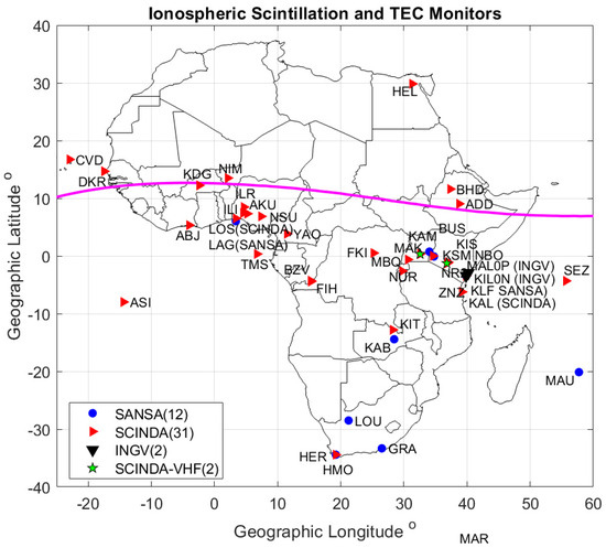 These instruments are primarily used for L-band monitoring of scintillations on GNSS signals traversing through the ionosphere. Figure 1 and Table 1 below show the distribution of GNSS ionospheric scintillation receivers across the continent. The map in Figure 1 shows a limited number of GISTMs in North and Southern Africa, which are mid-latitude regions with a low incidence of ionospheric scintillation. East Africa stands out as the area with the largest number of instruments for GISTM, followed by West Africa [5,6,7,8,9,10,11,12,13,14]. The line running from the geographic longitude 10° to the east in Figure 1, Figure 3, Figure 4 and Figure 5, is the geomagnetic meridian.