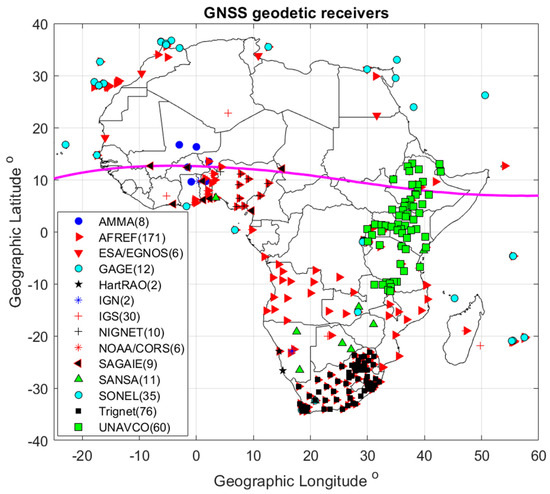 The Geodetic Facility for the Advancement of Geoscience (GAGE, formerly UNAVCO, University NAVSTAR Consortium) is a non-profit university-governed consortium funded by the National Science Foundation (NSF) and The National Aeronautics and Space Administration (NASA). It provides technical support to scientists for geodesy, tectonic, and geophysical events and education. It is responsible for archiving and disseminating measurements in RINEX format. The main projects are for North America and the poles. However, for more than 20 years, UNAVCO has supported a project covering the African continent (‘AfricaArray’), with the installation of many GNSS receivers mainly around the East African Rift for a few months up to several years, which can be used for space weather research (Figure 4). The files are available on their site via ftp or web GUI [21].