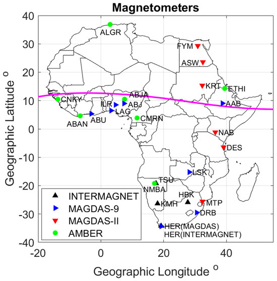 - Magnetic Data Acquisition System (MAGDAS) stations in Africa [32,33,34,35,36,37,38]